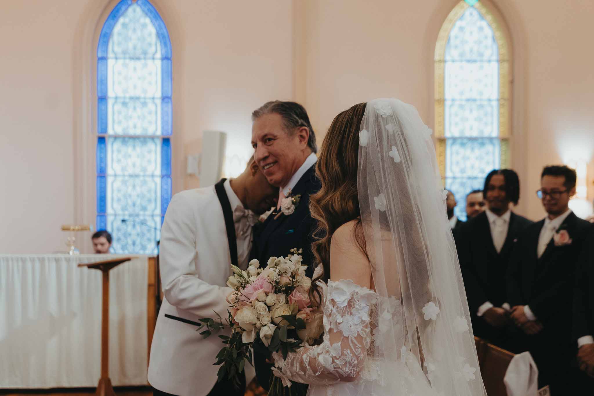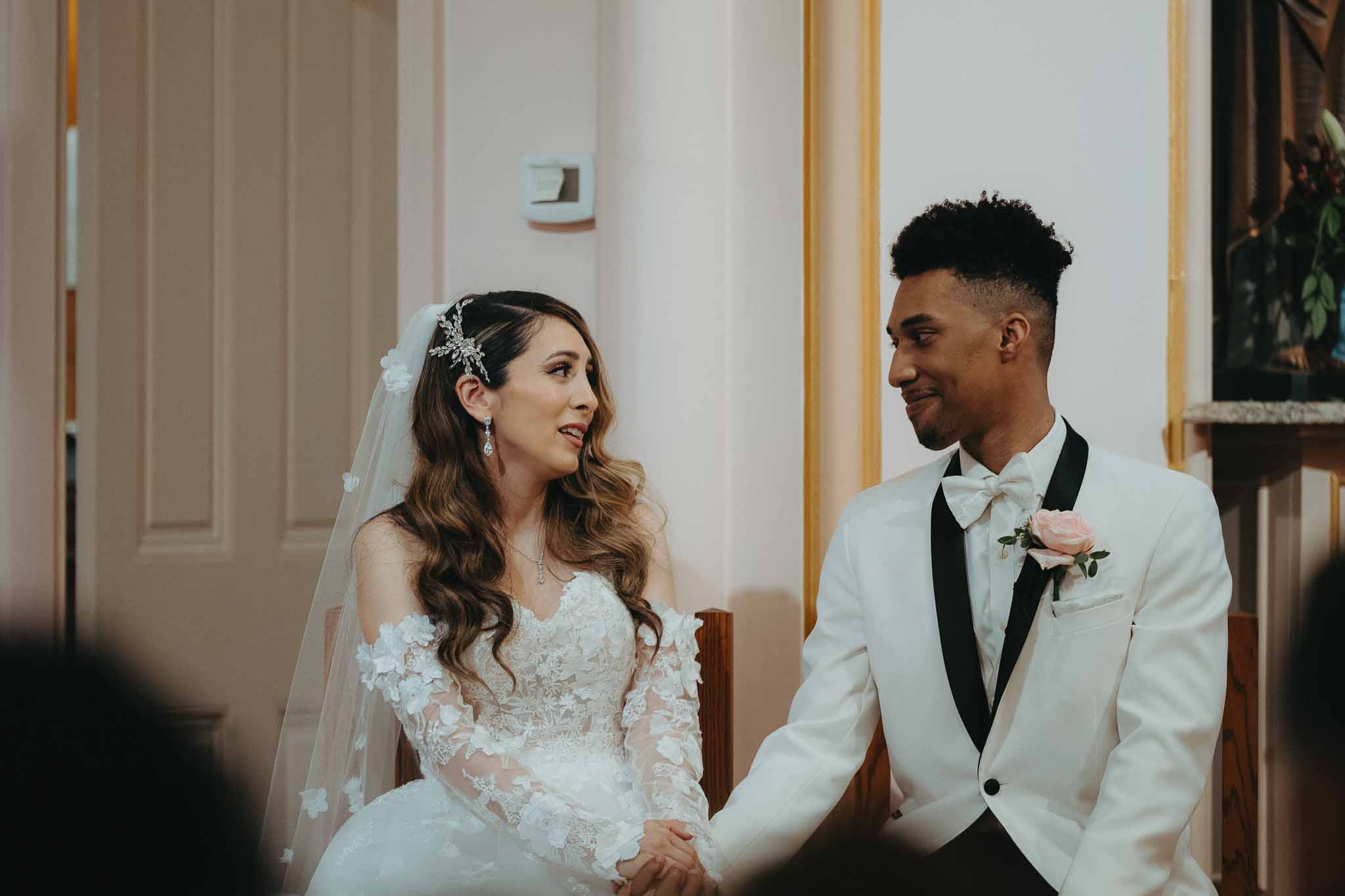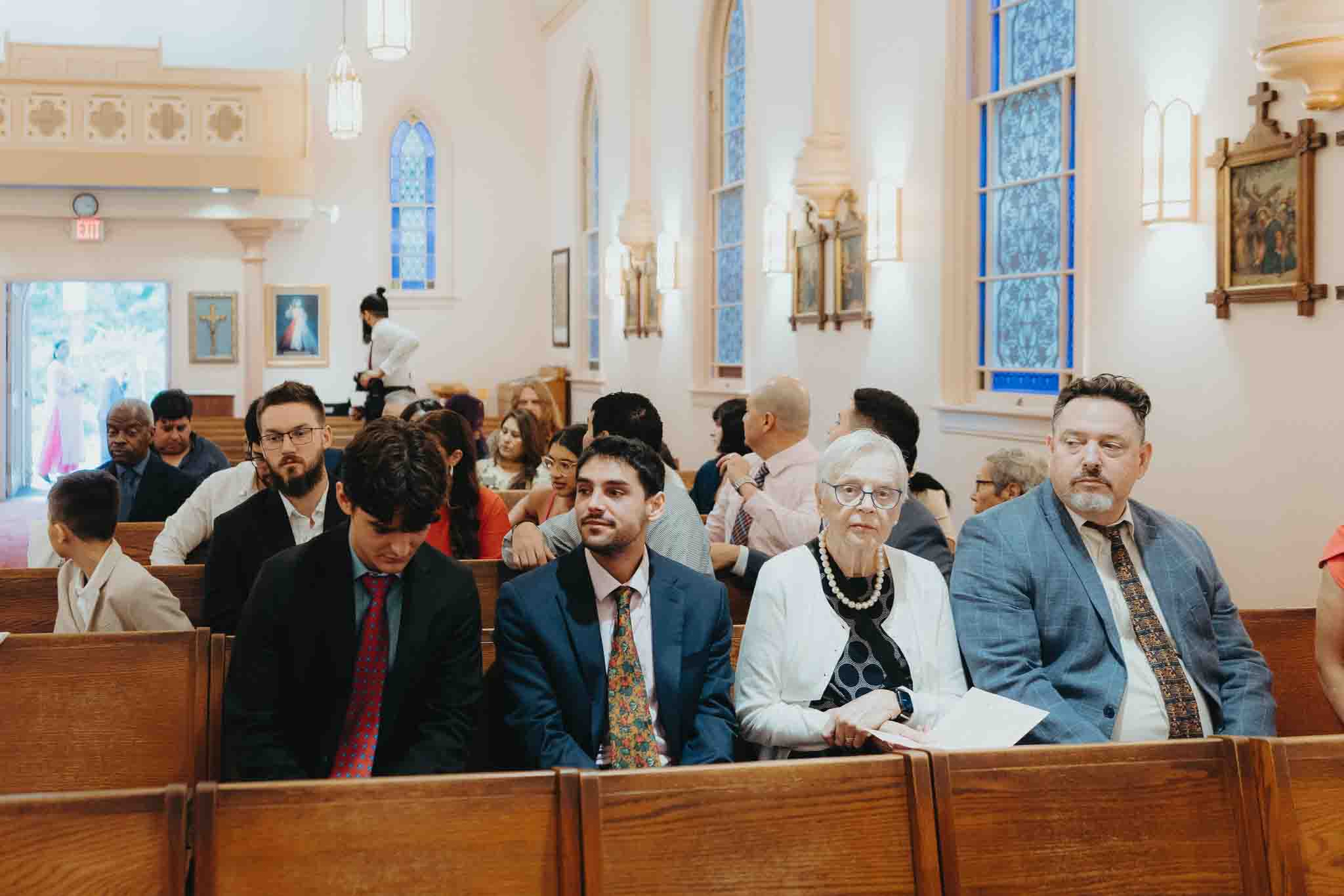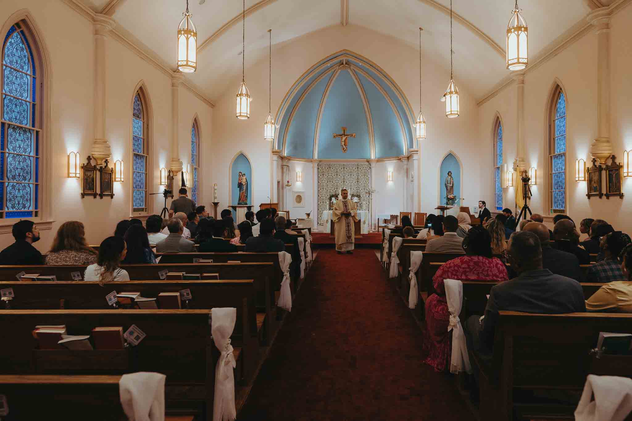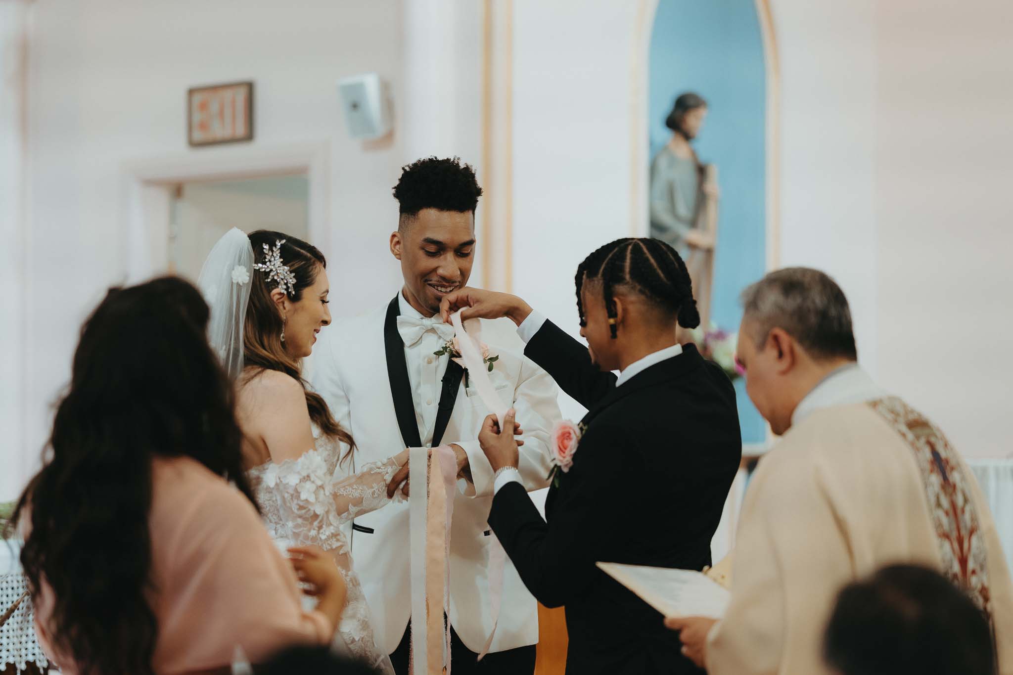 The ceremony took place at St. Rose of Lima Parish — a reverent Catholic service officiated by Deacon Frank. The couple honored their family with a memory table, rosary, and personal vows. Light poured in through the stained glass, surrounding them in a peaceful glow as they tied the knot.