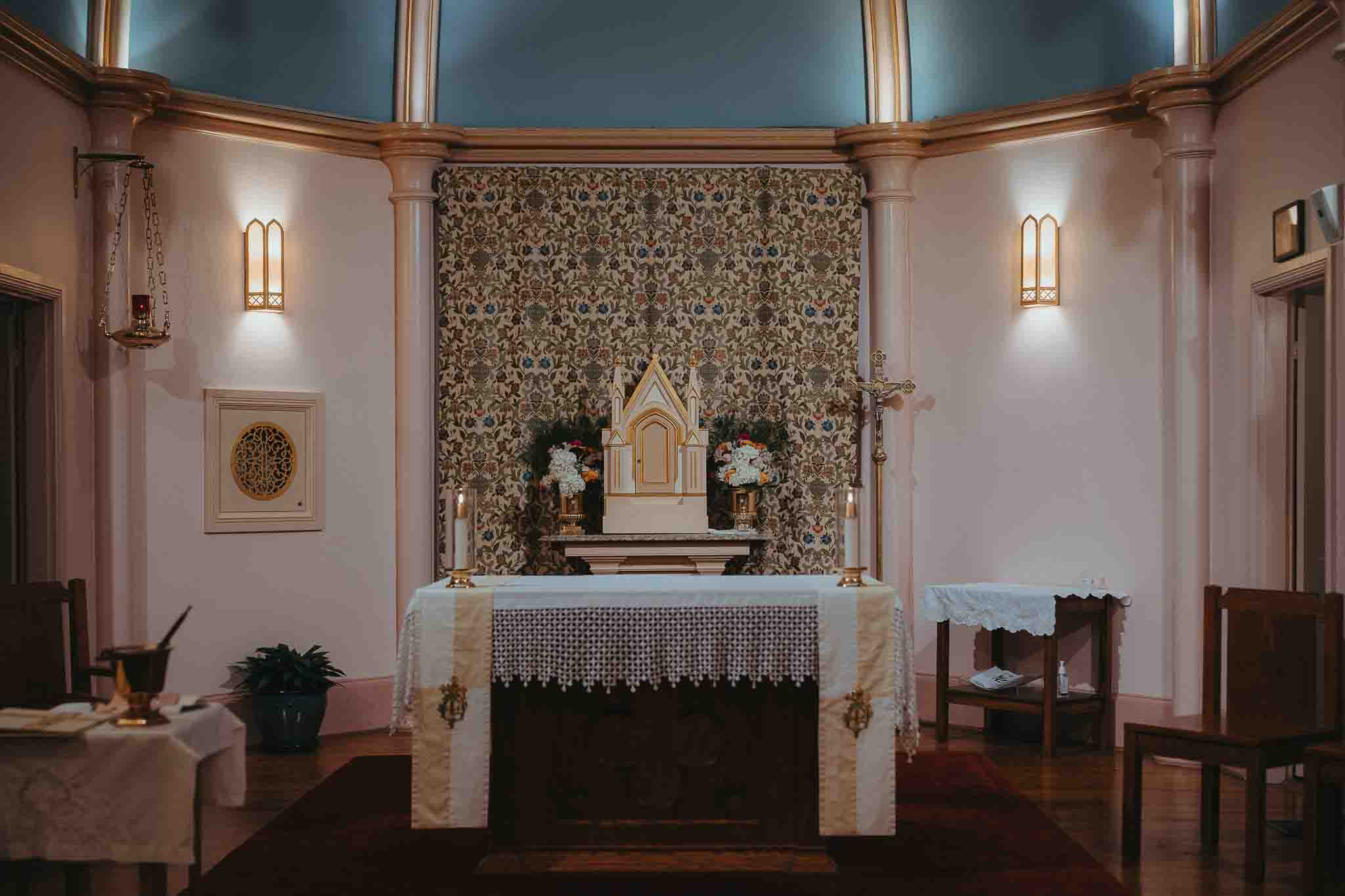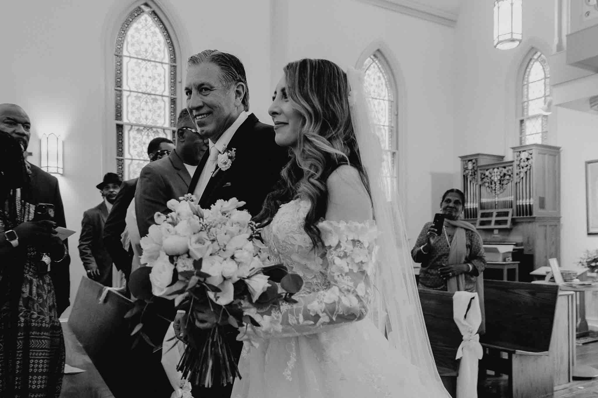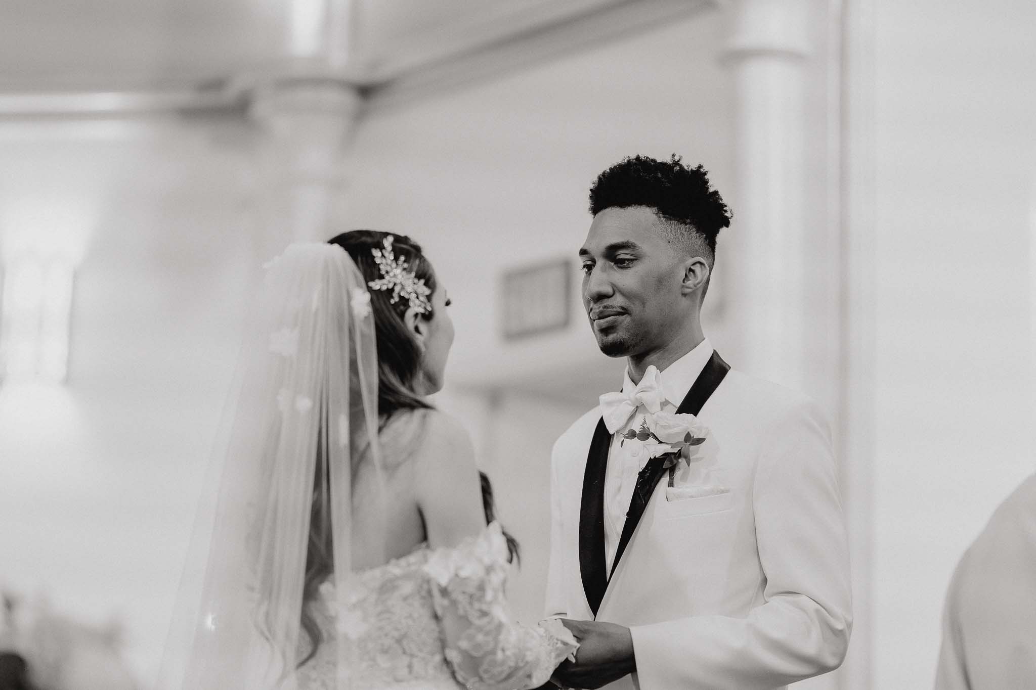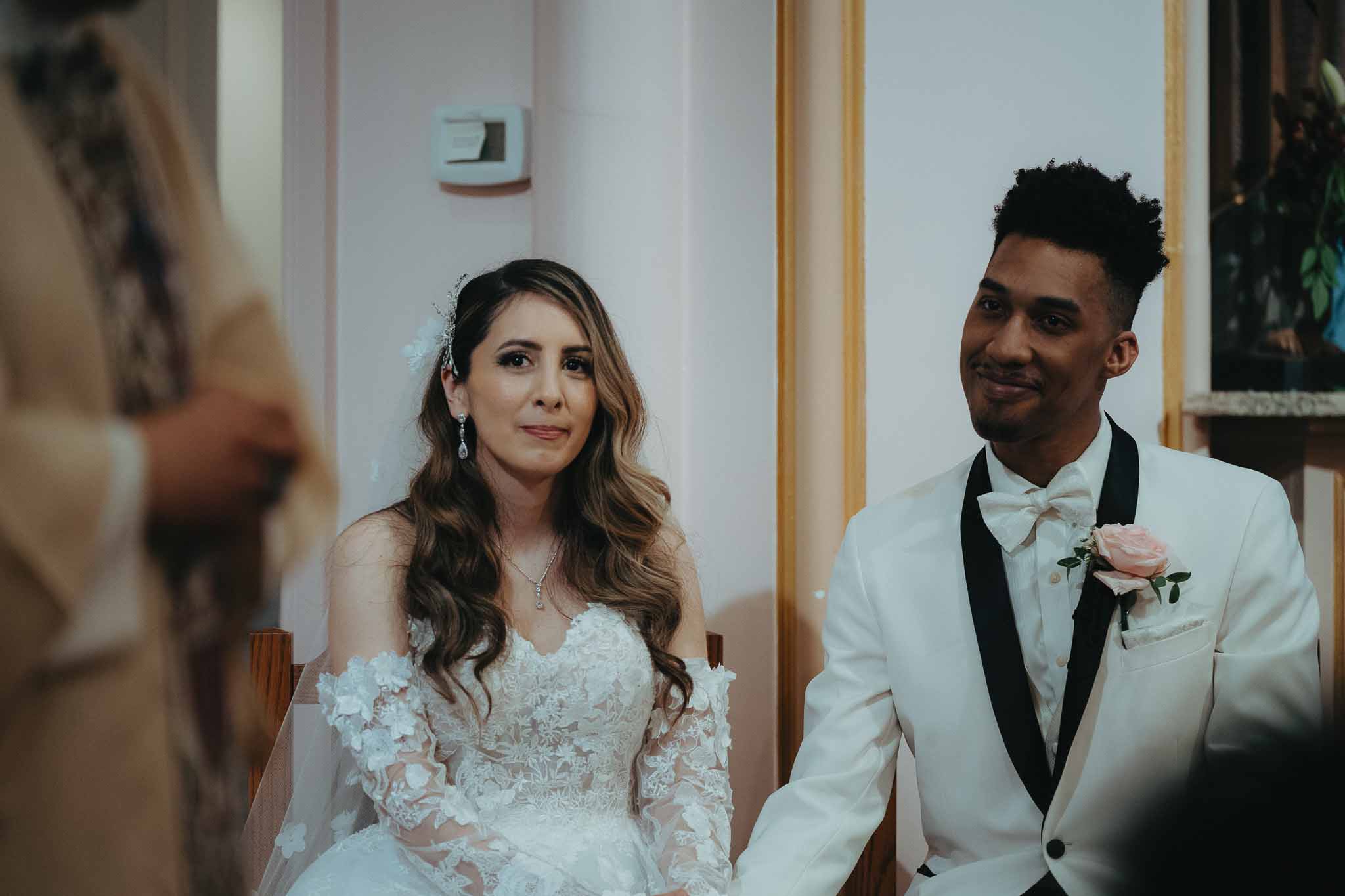 The ceremony took place at St. Rose of Lima Parish — a reverent Catholic service officiated by Deacon Frank. The couple honored their family with a memory table, rosary, and personal vows. Light poured in through the stained glass, surrounding them in a peaceful glow as they tied the knot.