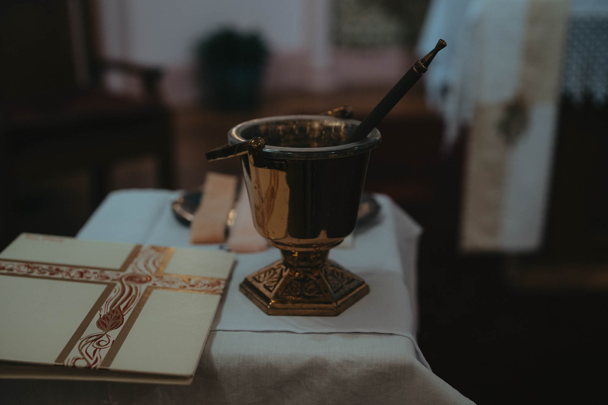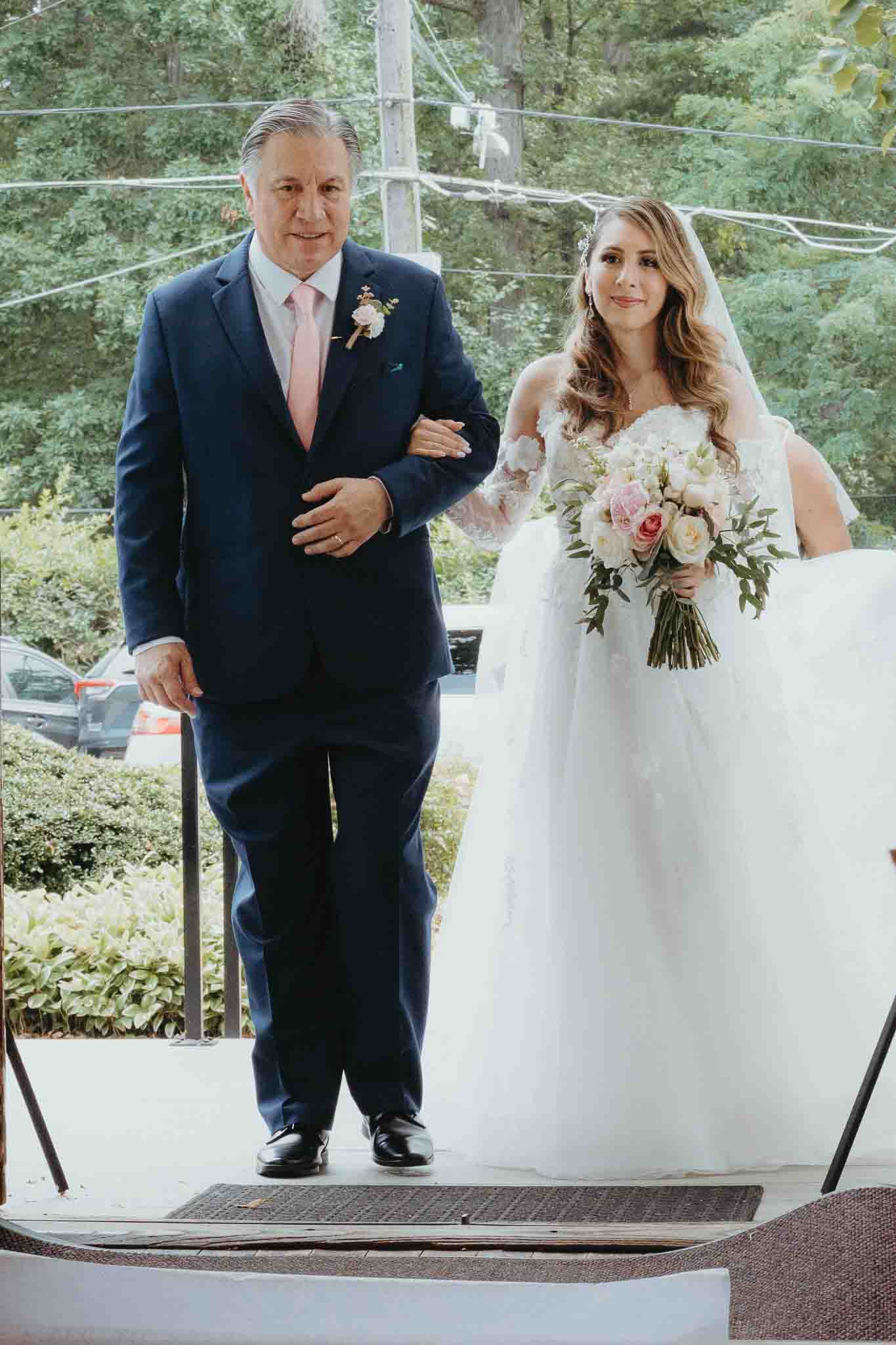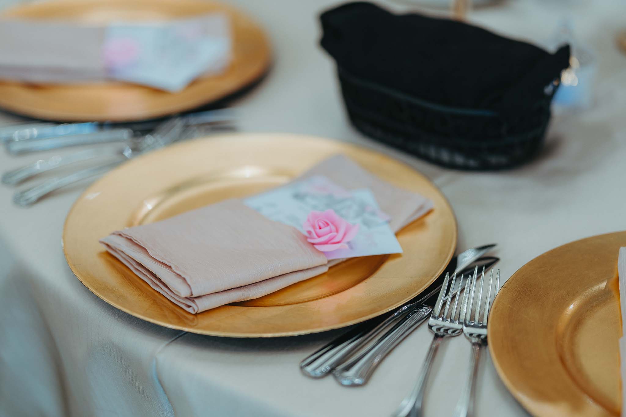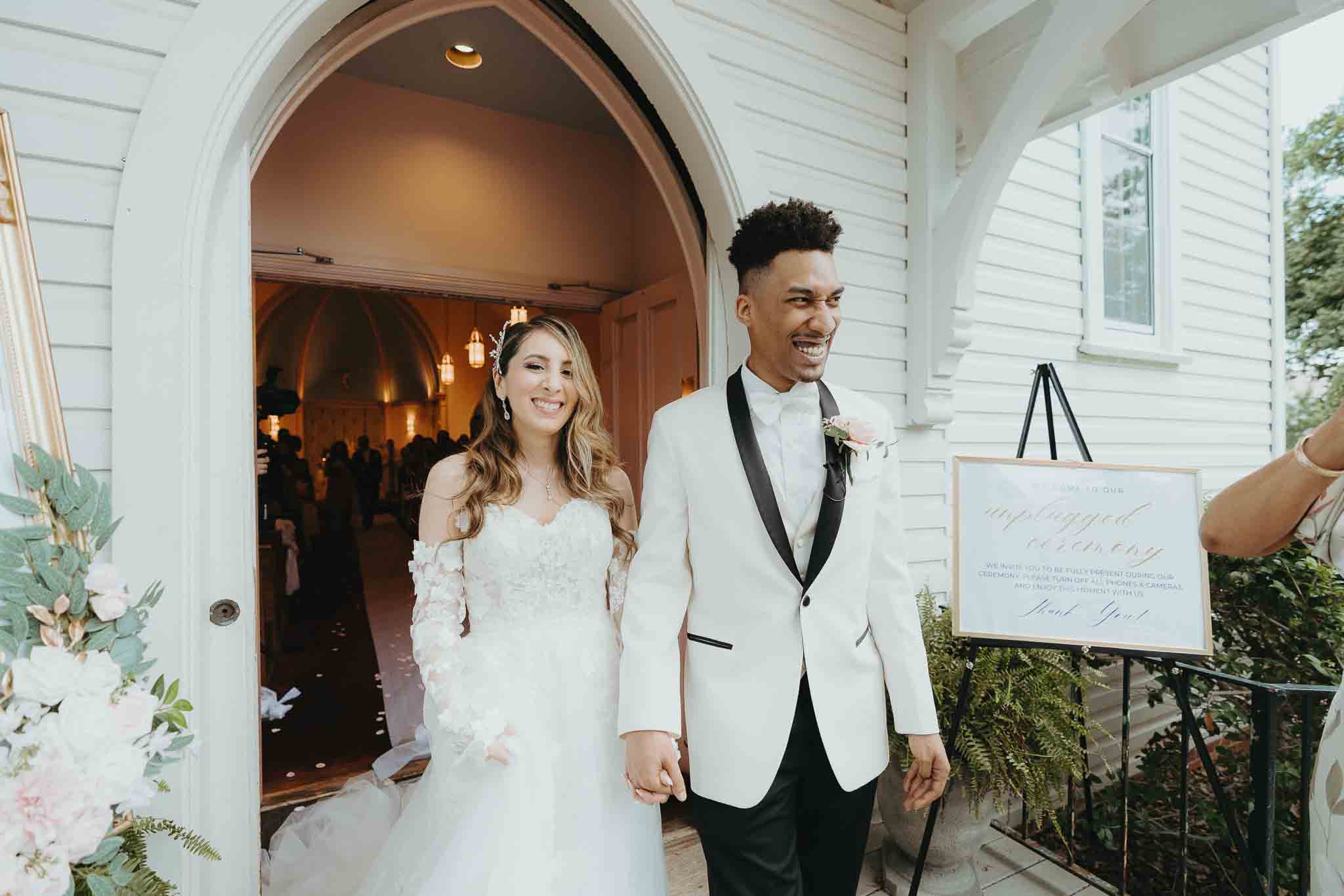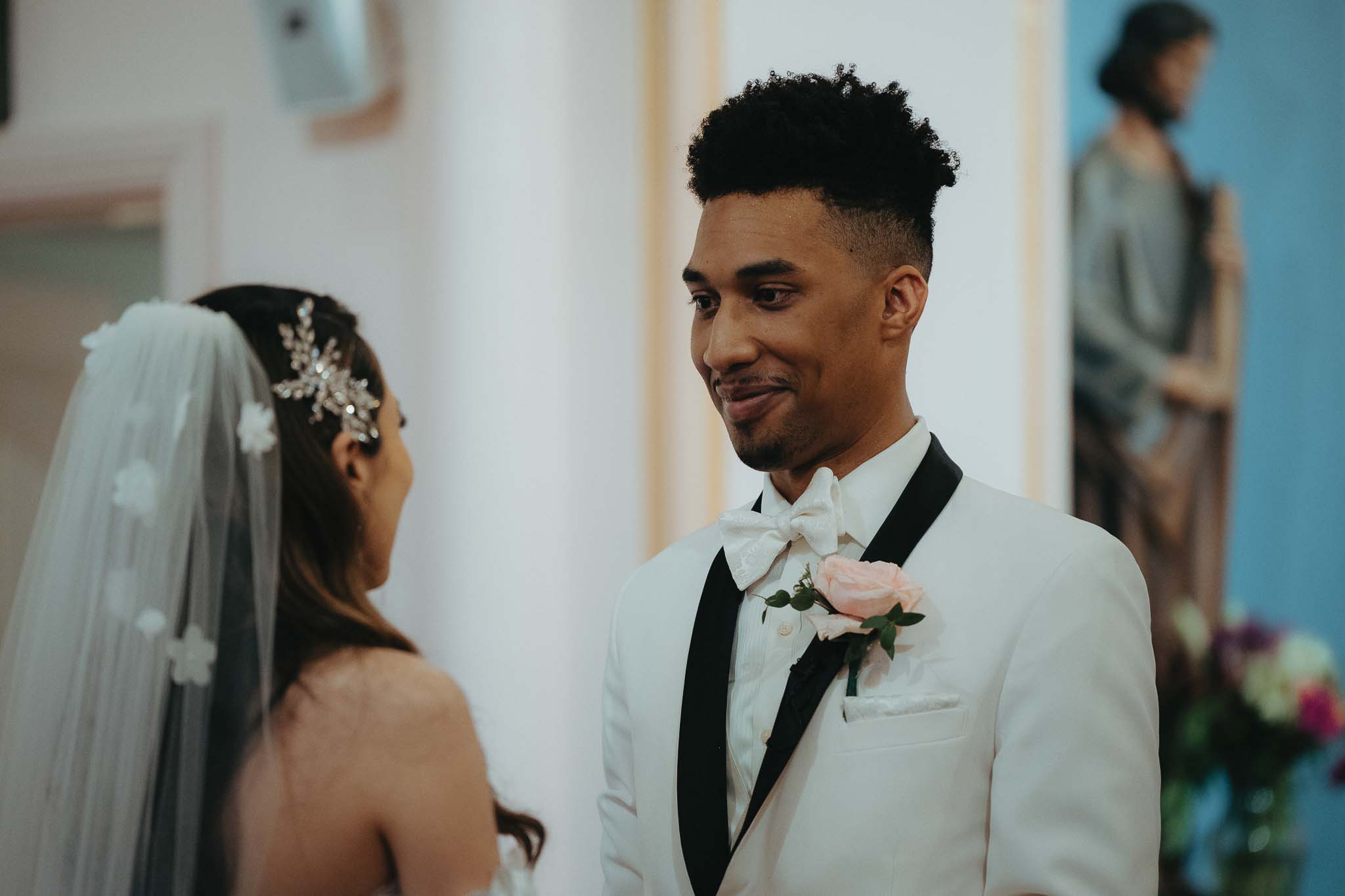 The ceremony took place at St. Rose of Lima Parish — a reverent Catholic service officiated by Deacon Frank. The couple honored their family with a memory table, rosary, and personal vows. Light poured in through the stained glass, surrounding them in a peaceful glow as they tied the knot.