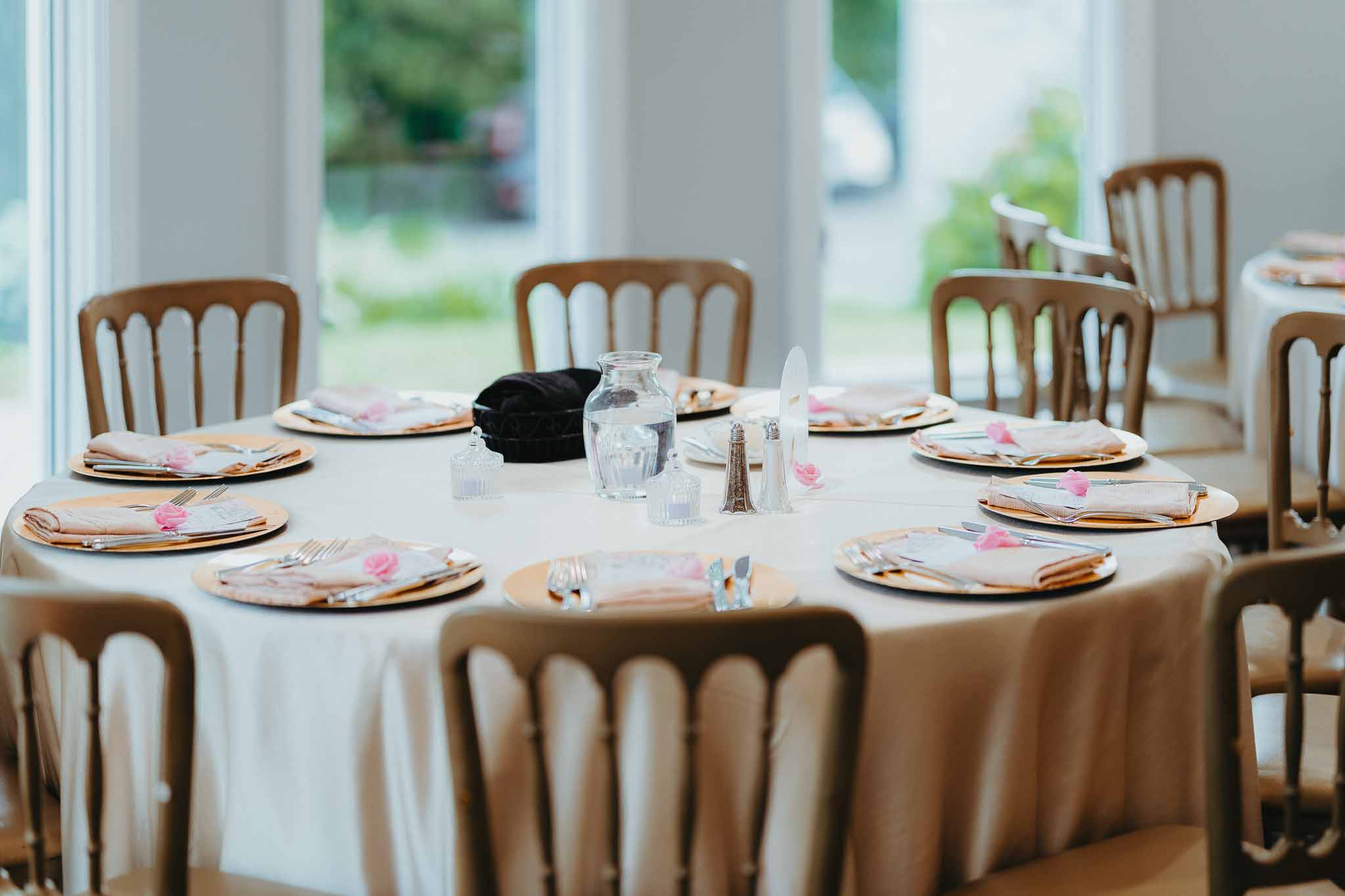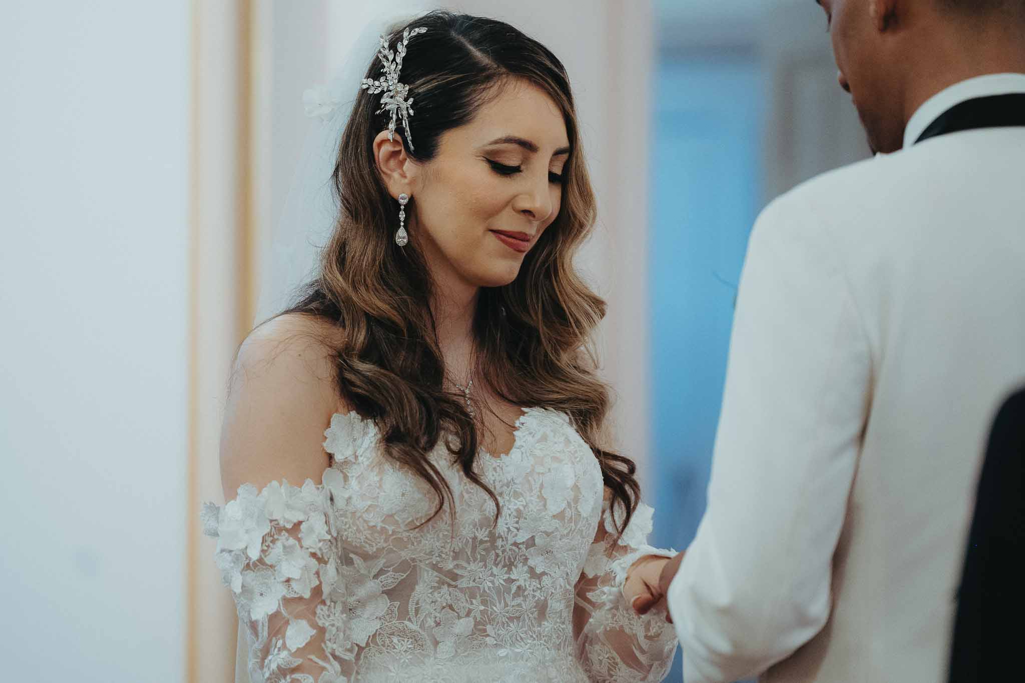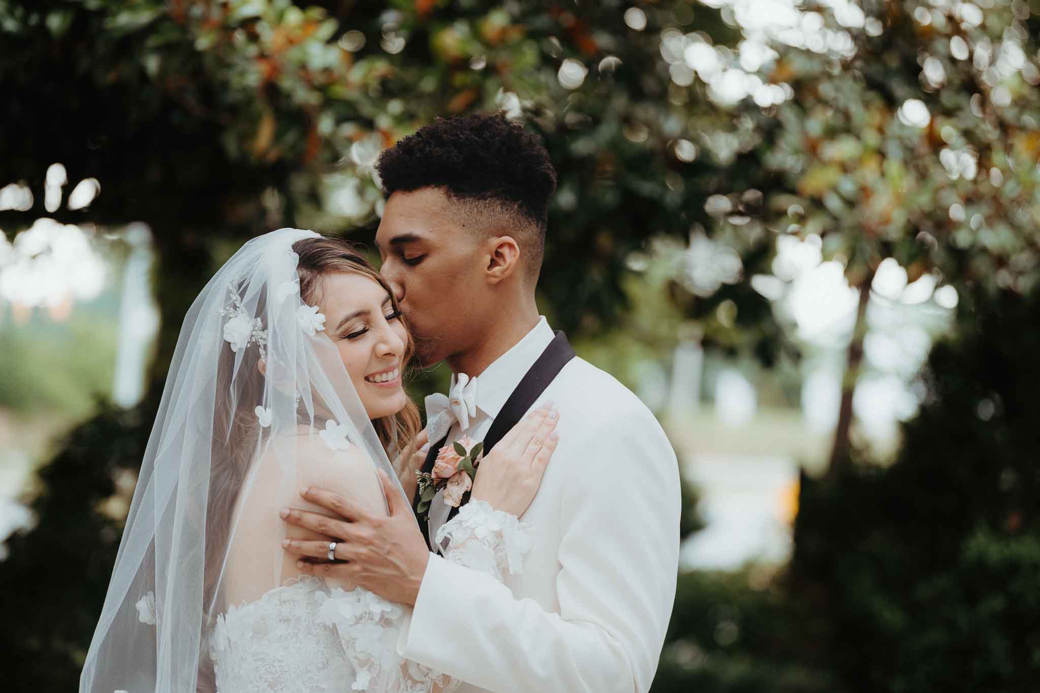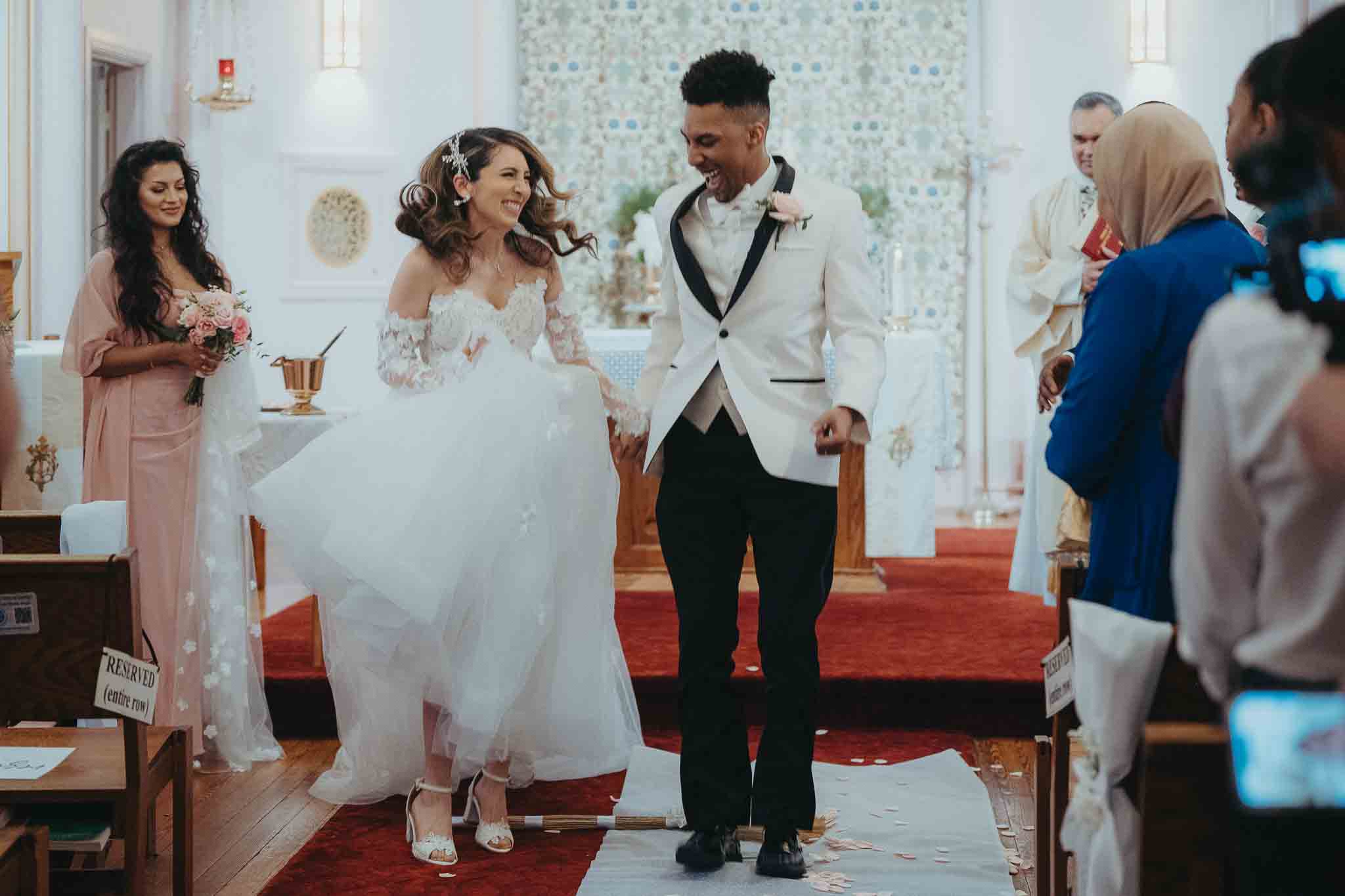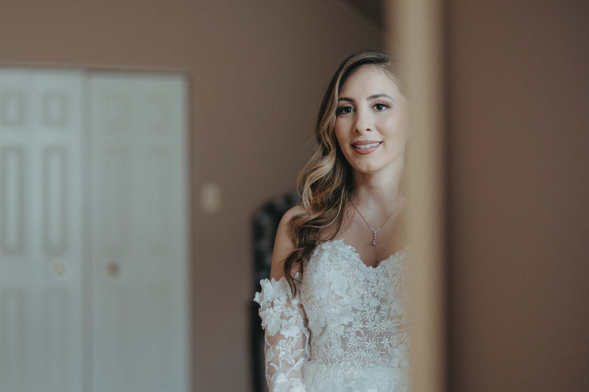 The ceremony took place at St. Rose of Lima Parish — a reverent Catholic service officiated by Deacon Frank. The couple honored their family with a memory table, rosary, and personal vows. Light poured in through the stained glass, surrounding them in a peaceful glow as they tied the knot.