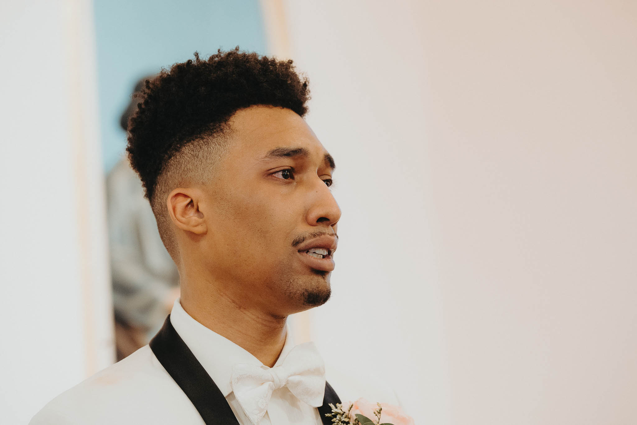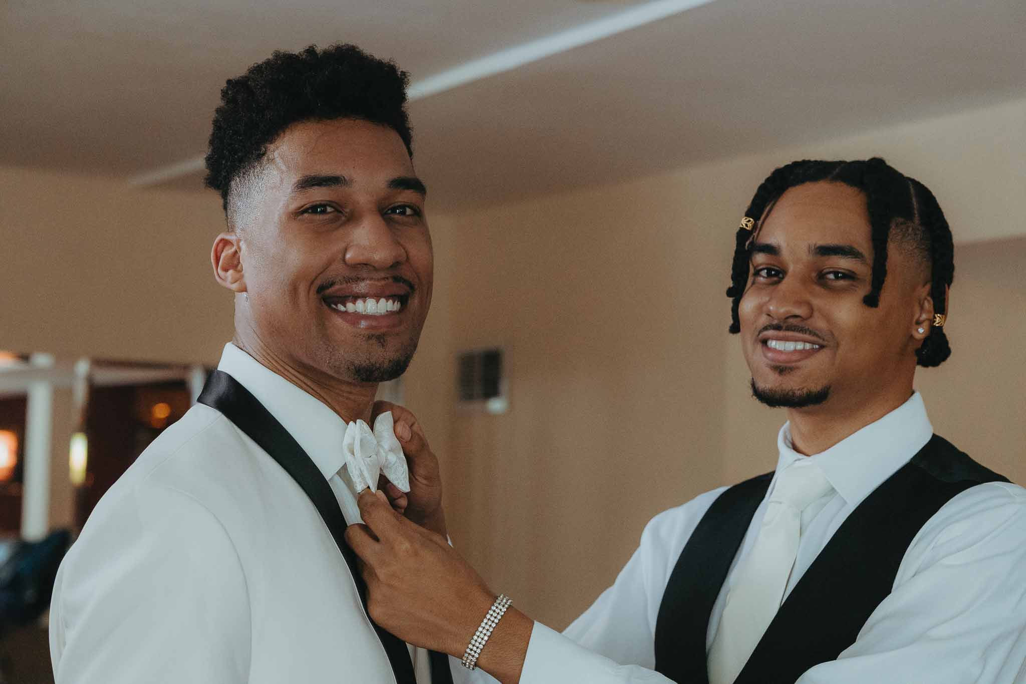 On a warm July day, Valerie got ready at her parents’ home in Germantown, surrounded by her closest friends, family, and their sweet dog Rosie. There were delicate heirlooms laid out — a rosary, vow books, ring boxes, something borrowed, something blue. Nearby, Jawanza prepared for the day with quiet joy.